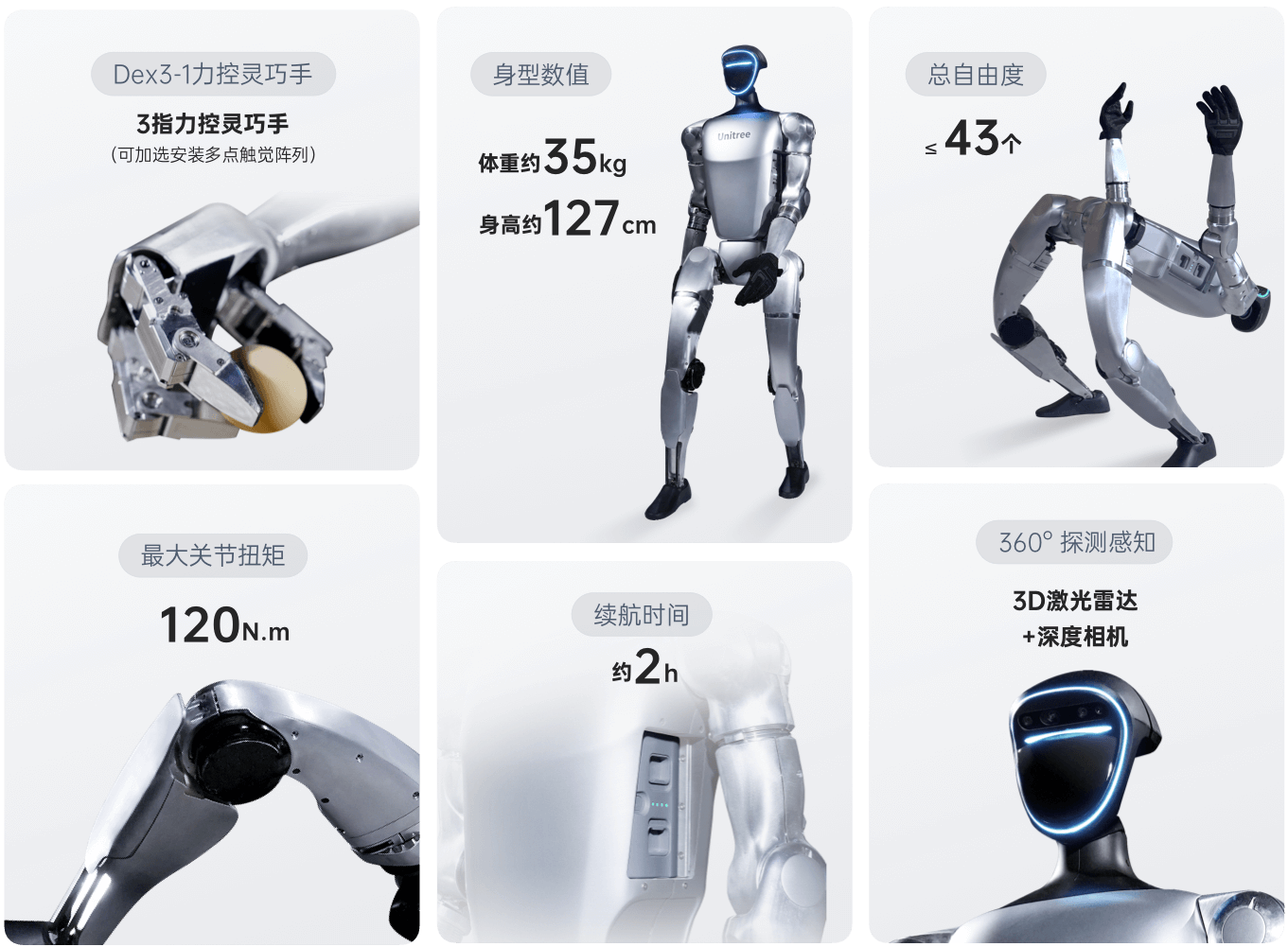 Unitree G1 是宇树科技(Unitree Robotics)公司于5月13日发布的人形机器人,它是国内首款能跑的全尺寸通用人形机器人,具有360°全景深度感知能力,这款机器人不仅具备超大关节运动角度和多达34个关节,还结合了力位混合控制技术,能够模拟人手进行精准操作。另外,Unitree G1由UnifoLM(Unitree机器人统一大模型)驱动,拥有自我学习和迭代升级的强大能力。